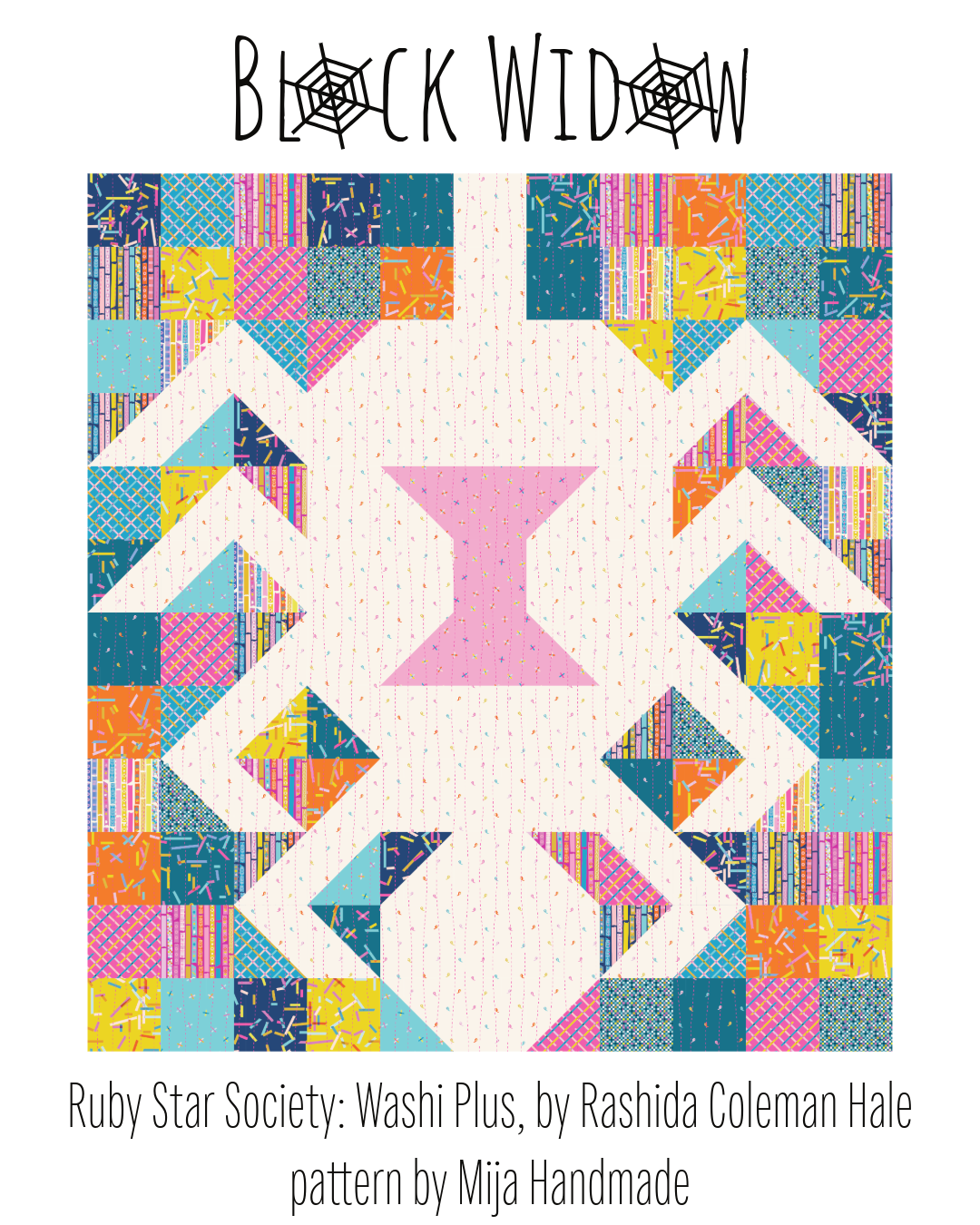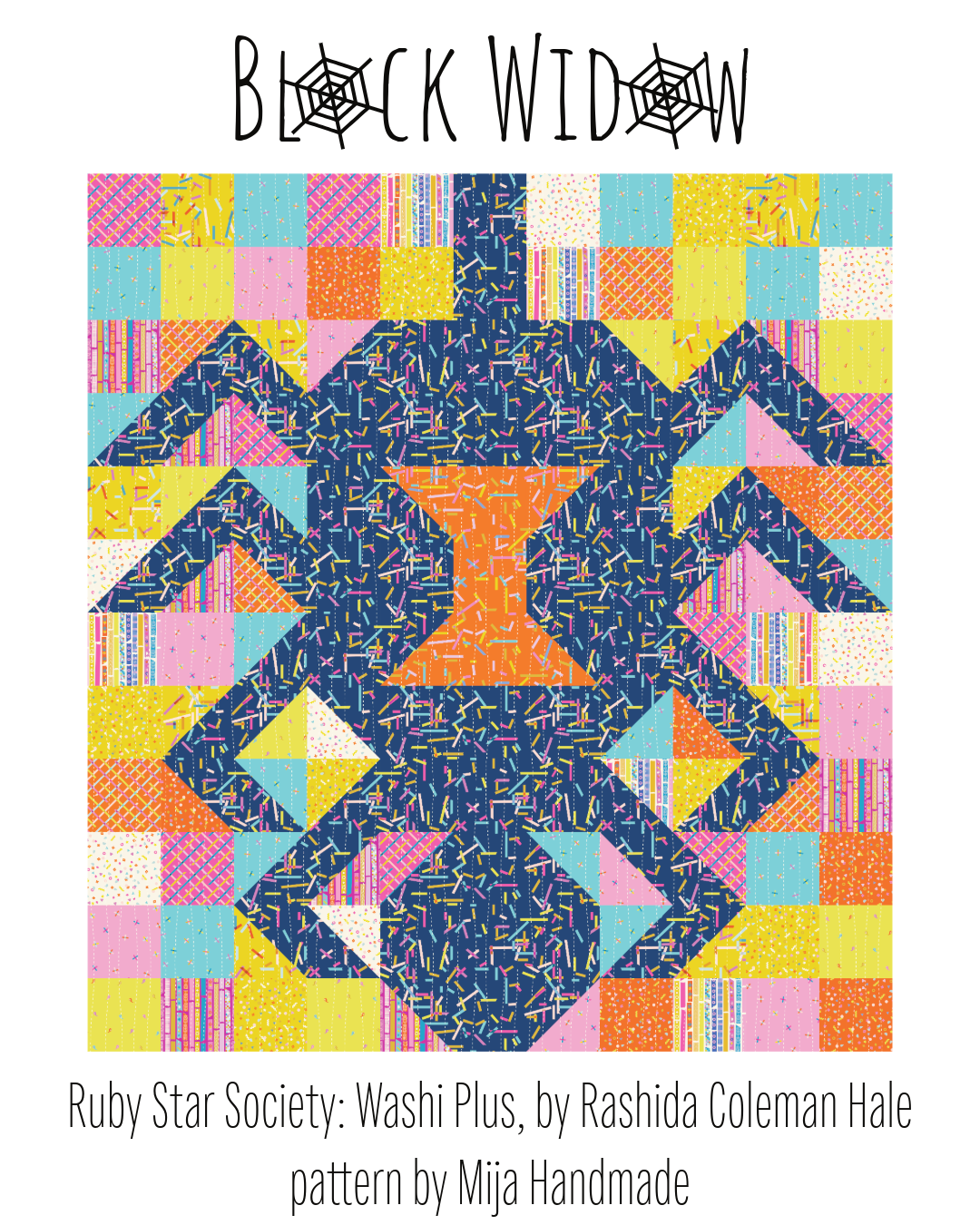 Washi Plus by Rashida Coleman Hale is hitting stores right now, and with these candy color fabrics, I couldn’t help but mock this up! If you like this version, the blue, orange, yellow and pink fabrics make a great scrappy background. Keep the cream fabrics for the spider body. In this version, I used the Roll With It in Natural for the spider body.