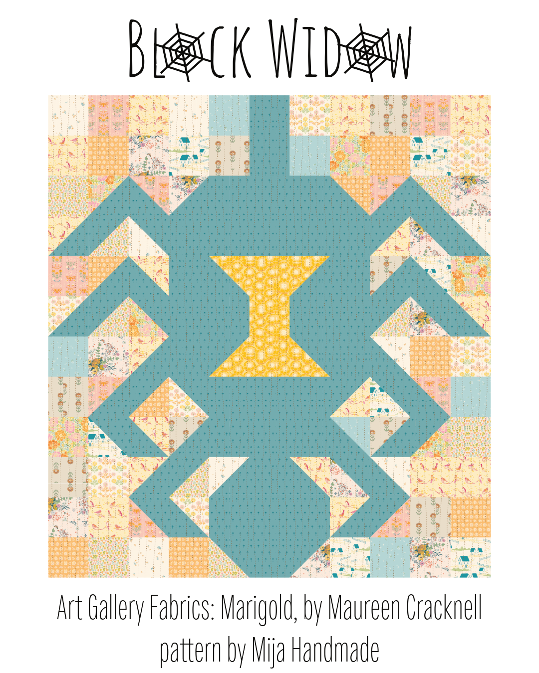 We’re straying far from the Halloween vibes of the quilt, but I just love the romantic background patchwork with Marigold fabrics by Maureen Cracknell. There’s something interesting about the contrast between the charming florals and spider design… it reminds me of Charlotte’s Web.