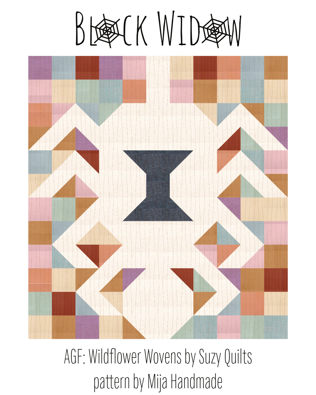 I haven’t worked with wovens too much, but the straightforward assembly of the Block Widow lends itself to working well with them. Here, I’ve used Wildflower Wovens by Suzy Quilts to create a cozy cottage vibe. If you go this route, use the light cream color for the spider body, and you’ll have to repeat a few colors in the background, as there are fewer fabrics in this line than the large throw calls for.