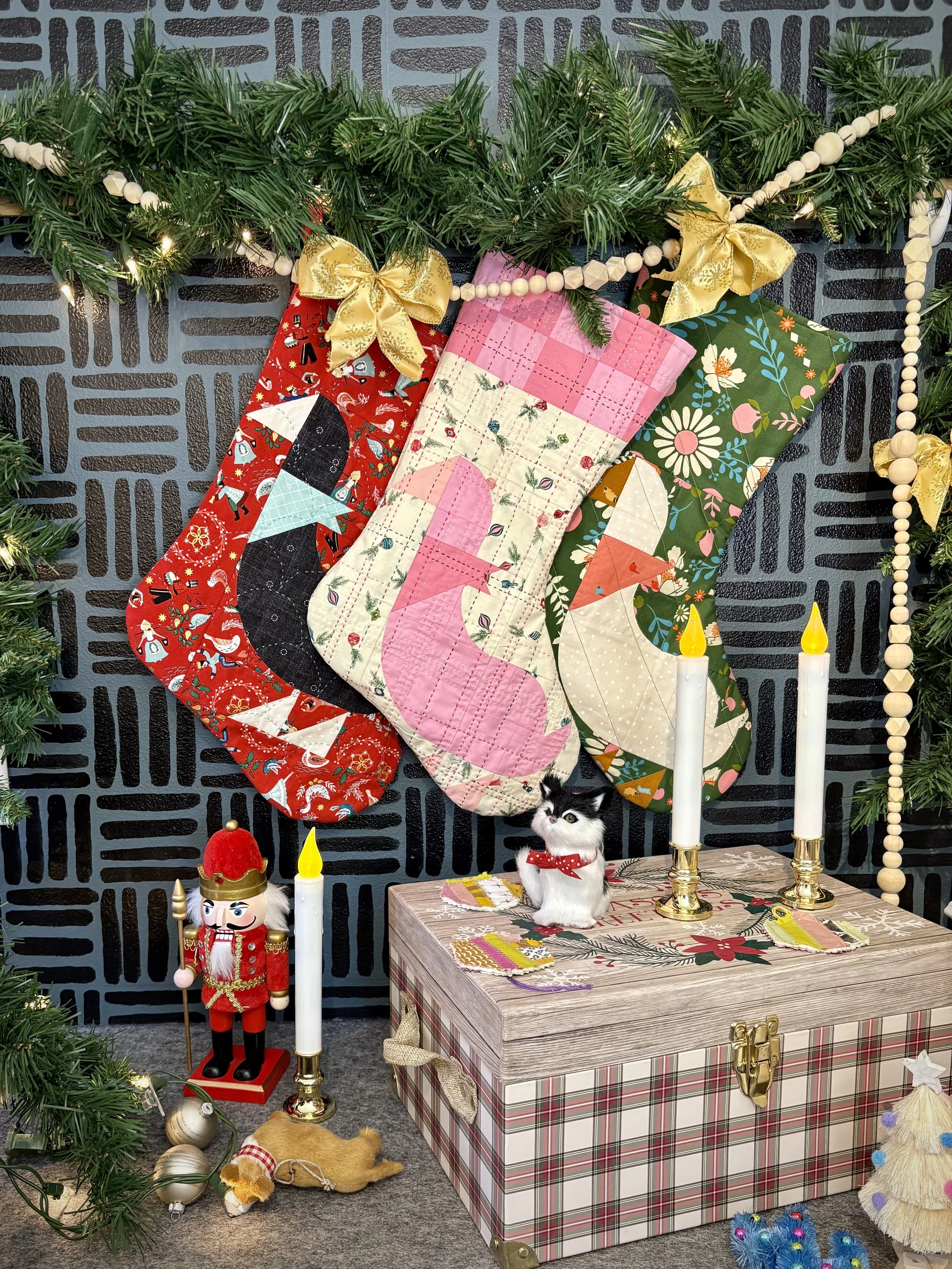 The template provides instructions to make three different stockings. The stockings are lined, and finish at 12" x 19", a perfect size for all your gift giving needs! Let me show off each one so you can pick your favorite style.
