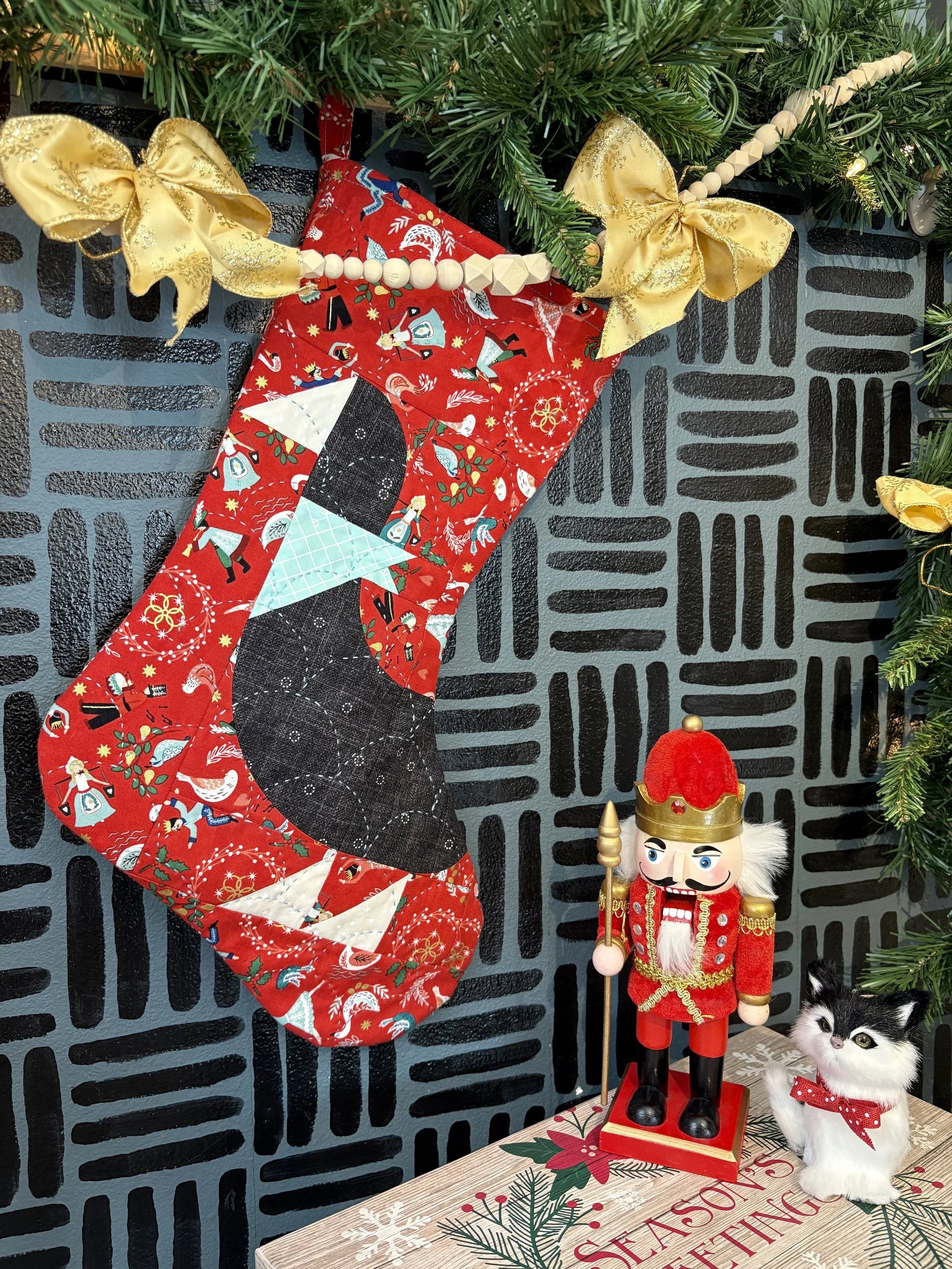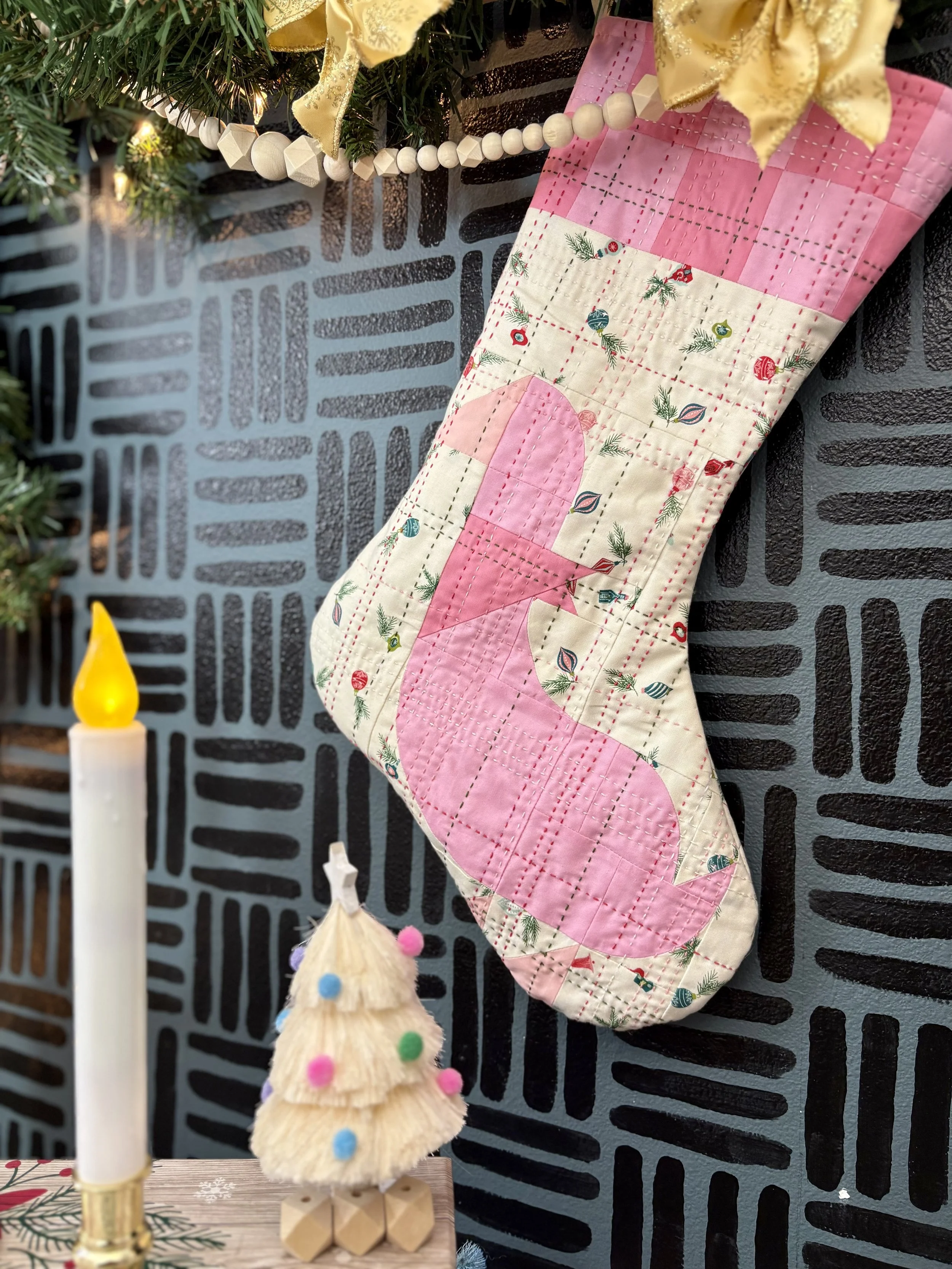 Option B is perfect for bigger scale prints. To make this version, you’ll add a large rectangle to the top of the Silly Goose block. The large piece of fabric gives those big motifs room to shine at the top of the stocking. I wanted the fabric to be the focus of this one, so I kept the quilting simple with some diagonal lines in a matching thread color.
