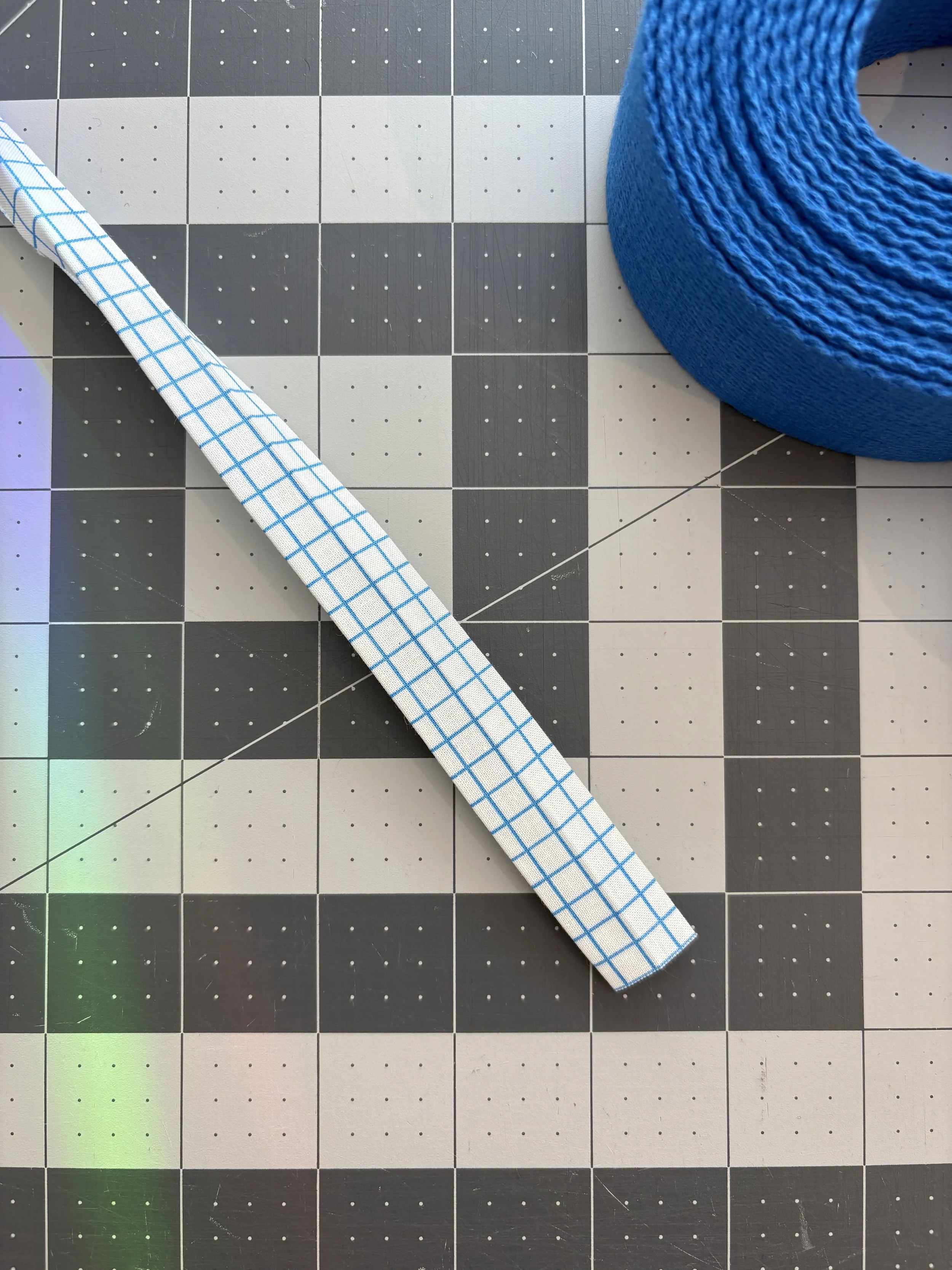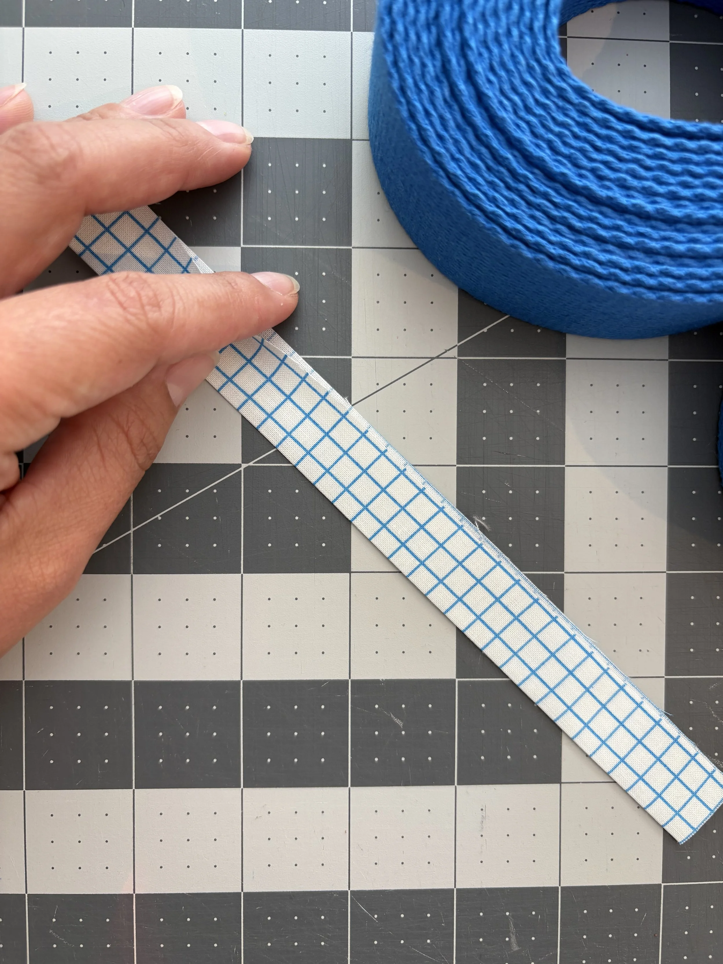 I wanted my decorative strip to be half the width of my webbing, or ¾". If you are using a different width of webbing or want a different size fabric strip, your measurements will vary.