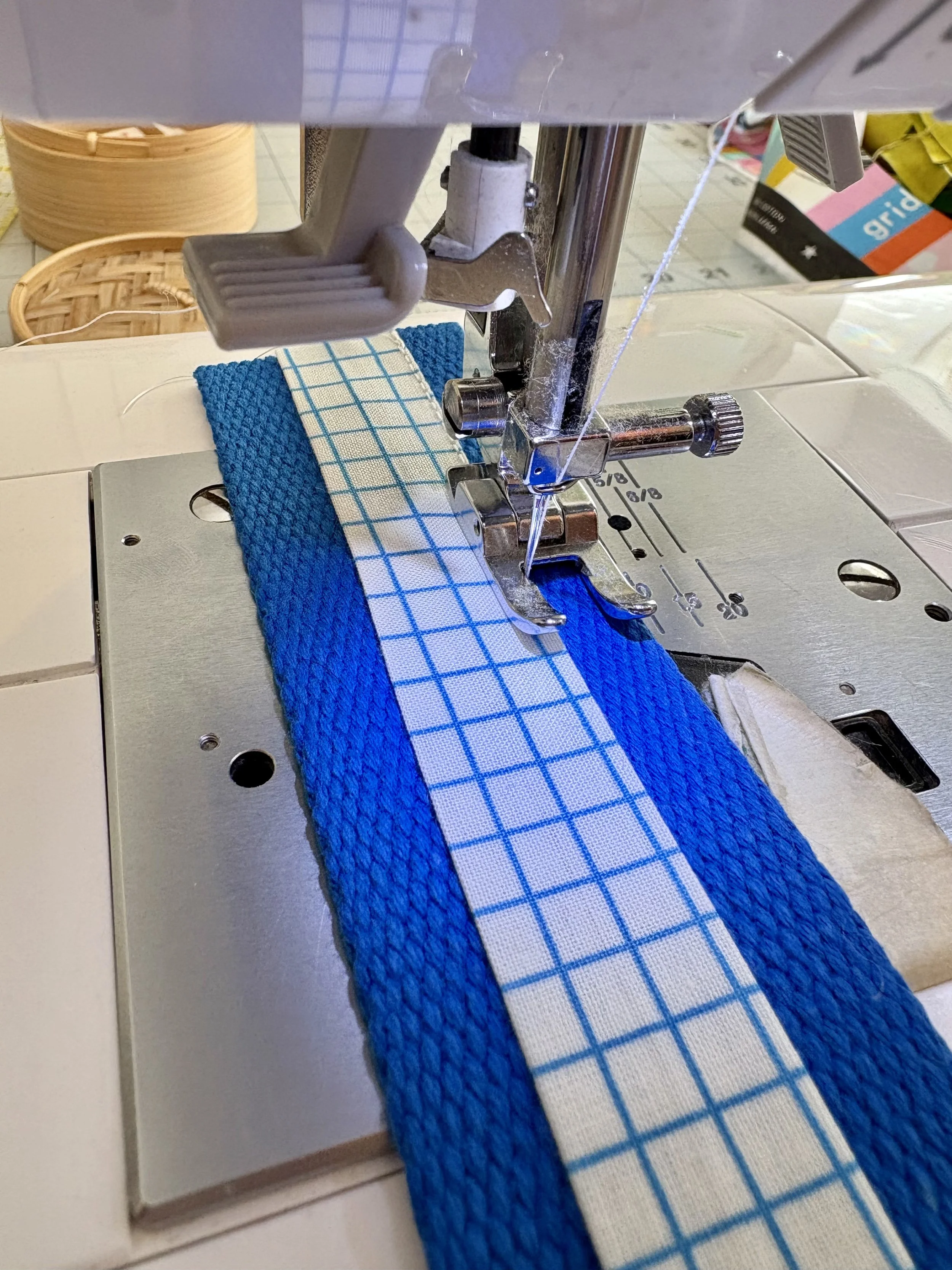 I have gone deep into the world of bag making. I’m constantly thinking about zippers, binding finishes, construction methods…and webbing! If you don’t know what webbing is, it’s the material bag patterns often direct you to use to make bag handles. You can get webbing in plain cotton for $3 to $4 per yard. Or you can get decorative webbing for $7 to $9 per yard.