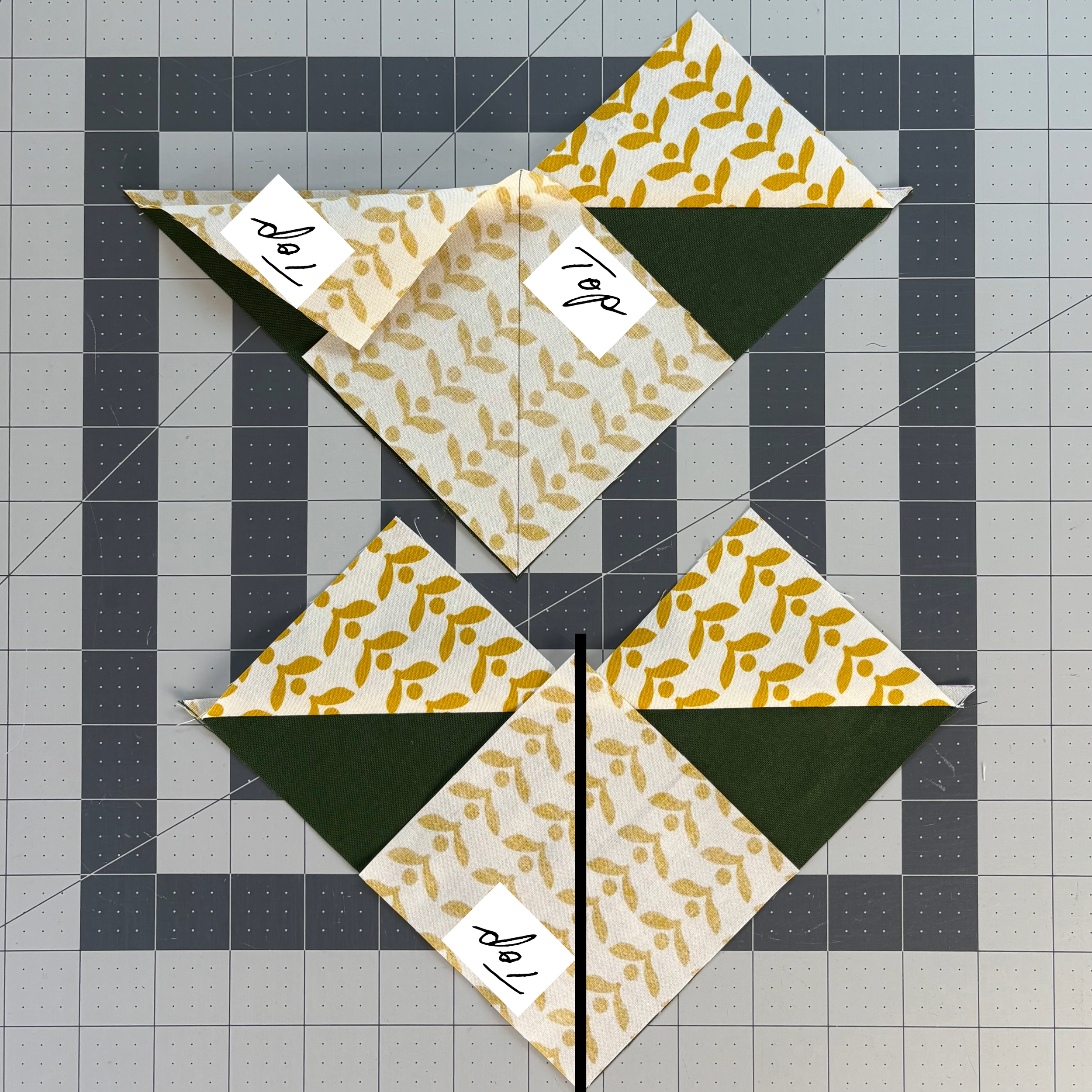 You’ll see in the first picture below, I’ve oriented the third and fourth sky square differently. In the top heart shaped unit, the Top is at the right of the sky square. In the bottom heart shaped unit, the Top is at the bottom left. Because this is a two-way directional fabric, it doesn’t matter which way the Top faces, as long as the drawn line is oriented correctly. We can check our work by flipping back the squares and previewing the orientation of the print.