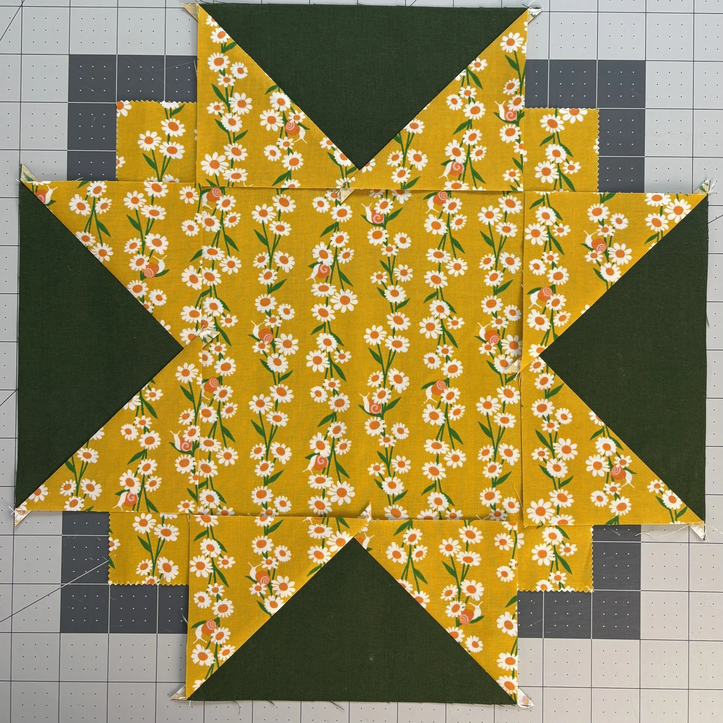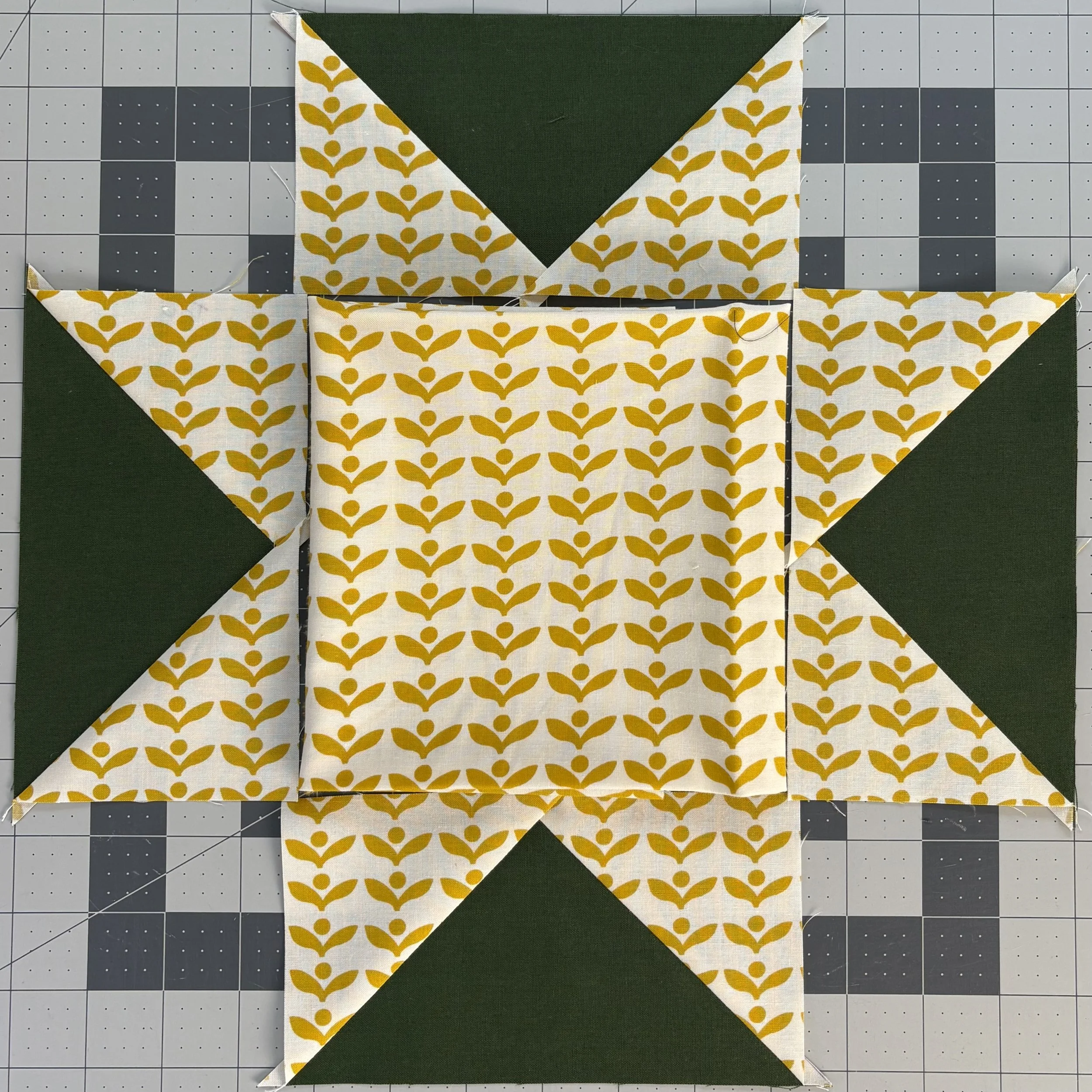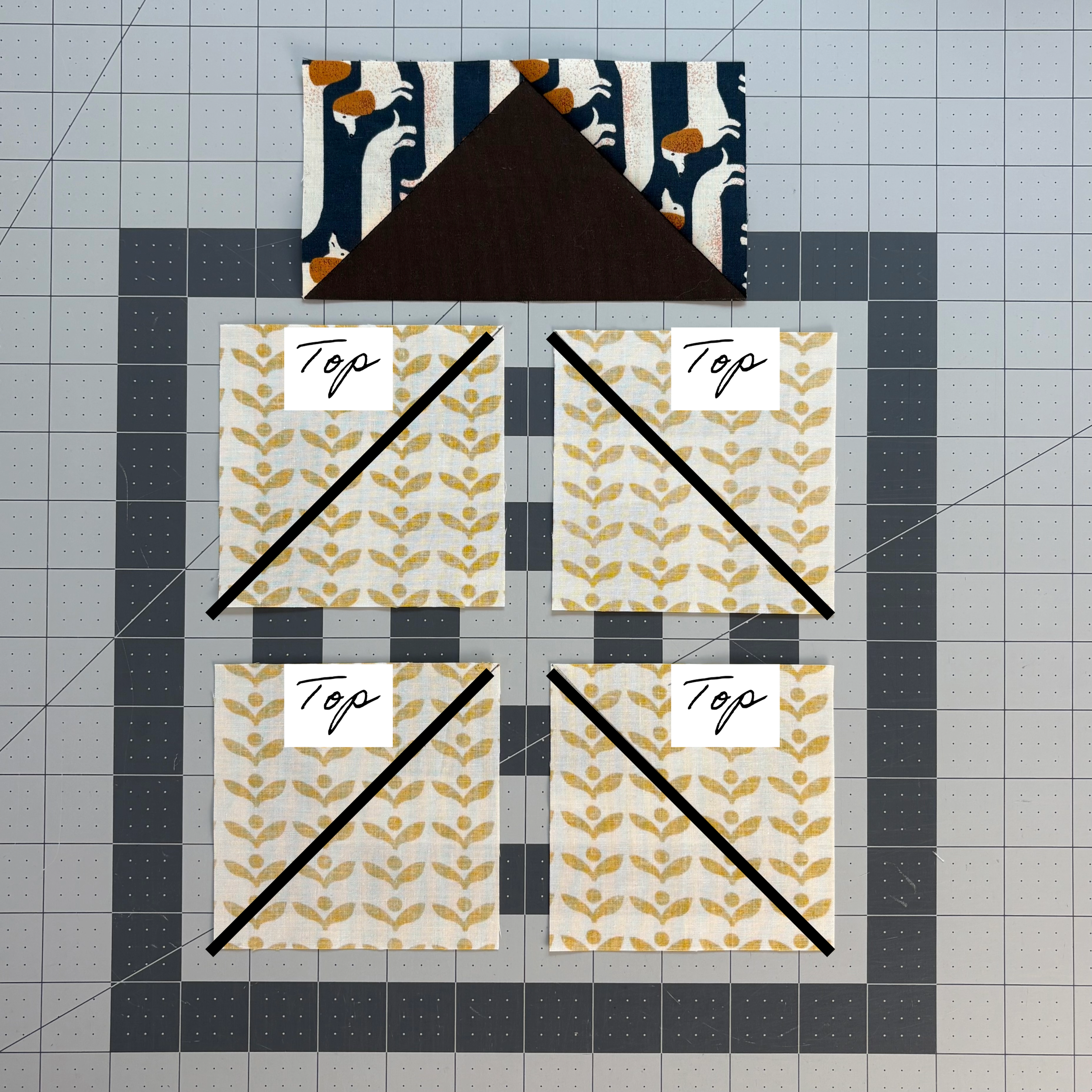 The units we’re about to make are perfect for quilt blocks like a sawtooth star. In a sawtooth star, some FG are used horizontally and some are used vertically, which means we need to make FG where the prints run both horizontally and vertically. If you are making a quilt that orients all the FG only horizontally or only vertically, the following methods may not be best for your project. Below, I assume some familiarity with the 4-at-a-time FG method. Follow along with me by collecting the following units: