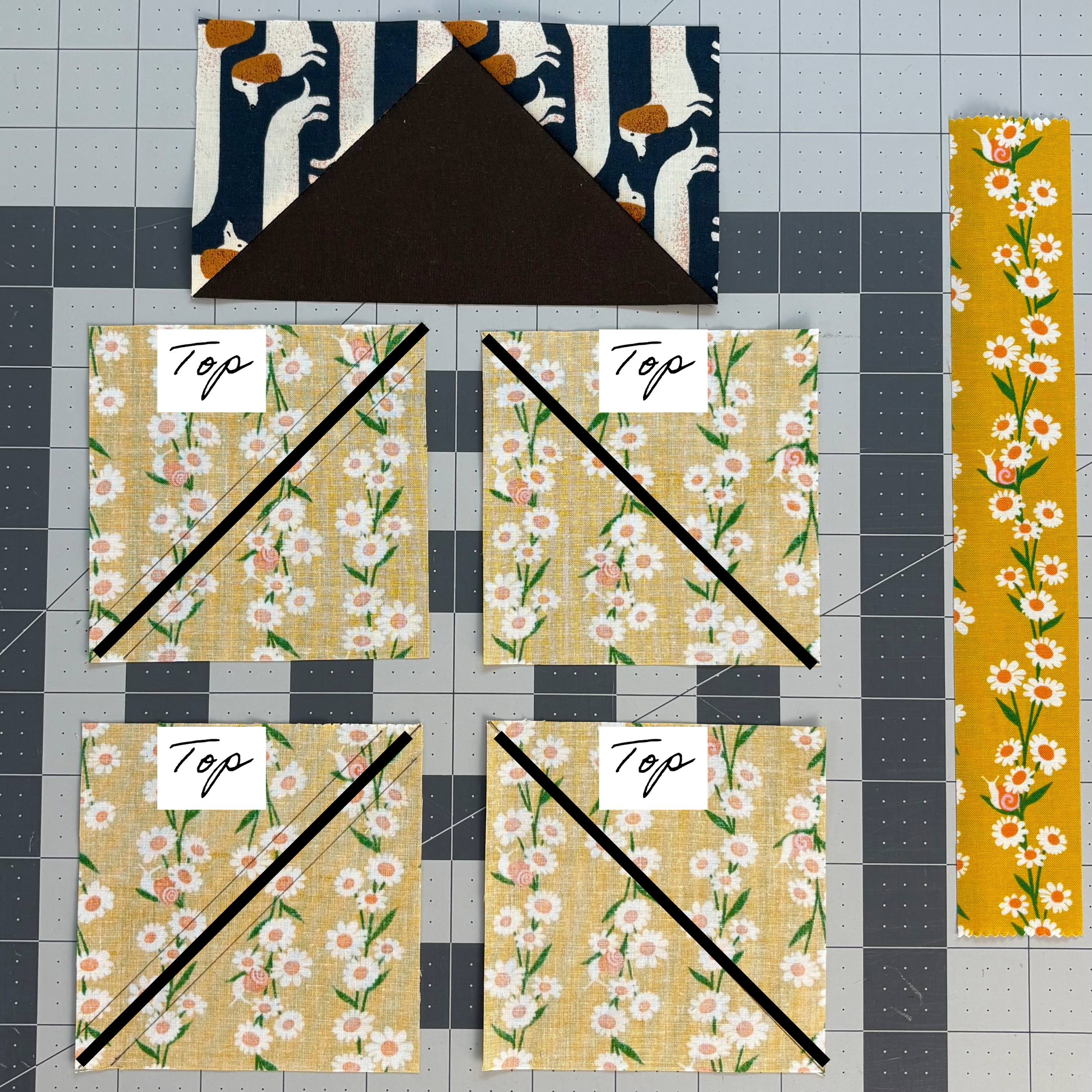2) Using the sky squares on the left of the above picture (the sky squares with the lines drawn from bottom left to top right), we’ll put them in opposite corners of the goose 7½" square, making sure the Top is to the left of the drawn line.