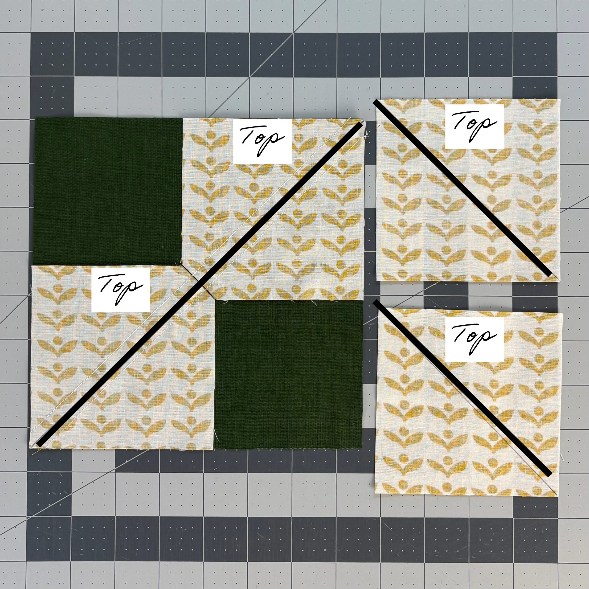 3) Once you’ve sewn ¼" away from both sides of the drawn line, cut down the drawn line and pressed your units, we’ll arrange the third and fourth sky squares. There’s almost nothing to think about in this step. Place each sky square so that the drawn line runs from the unsewn goose corner to the corner of the sewn sky squares. That’s it. But keep reading and I’ll explain the logic behind this step.
