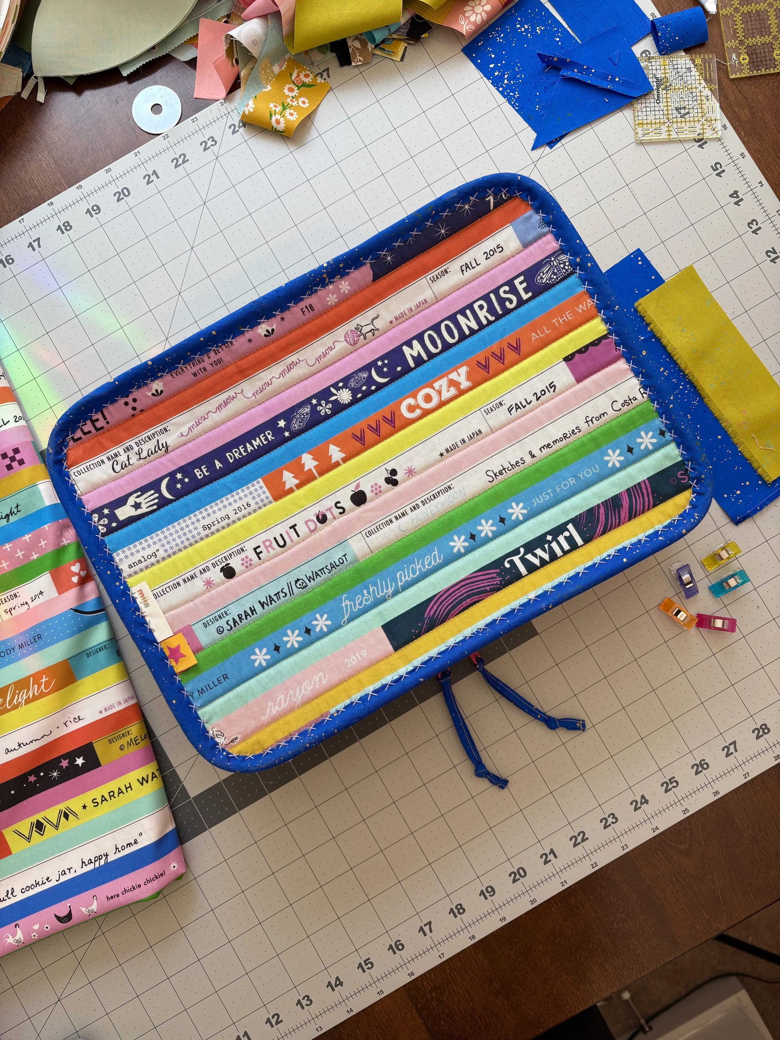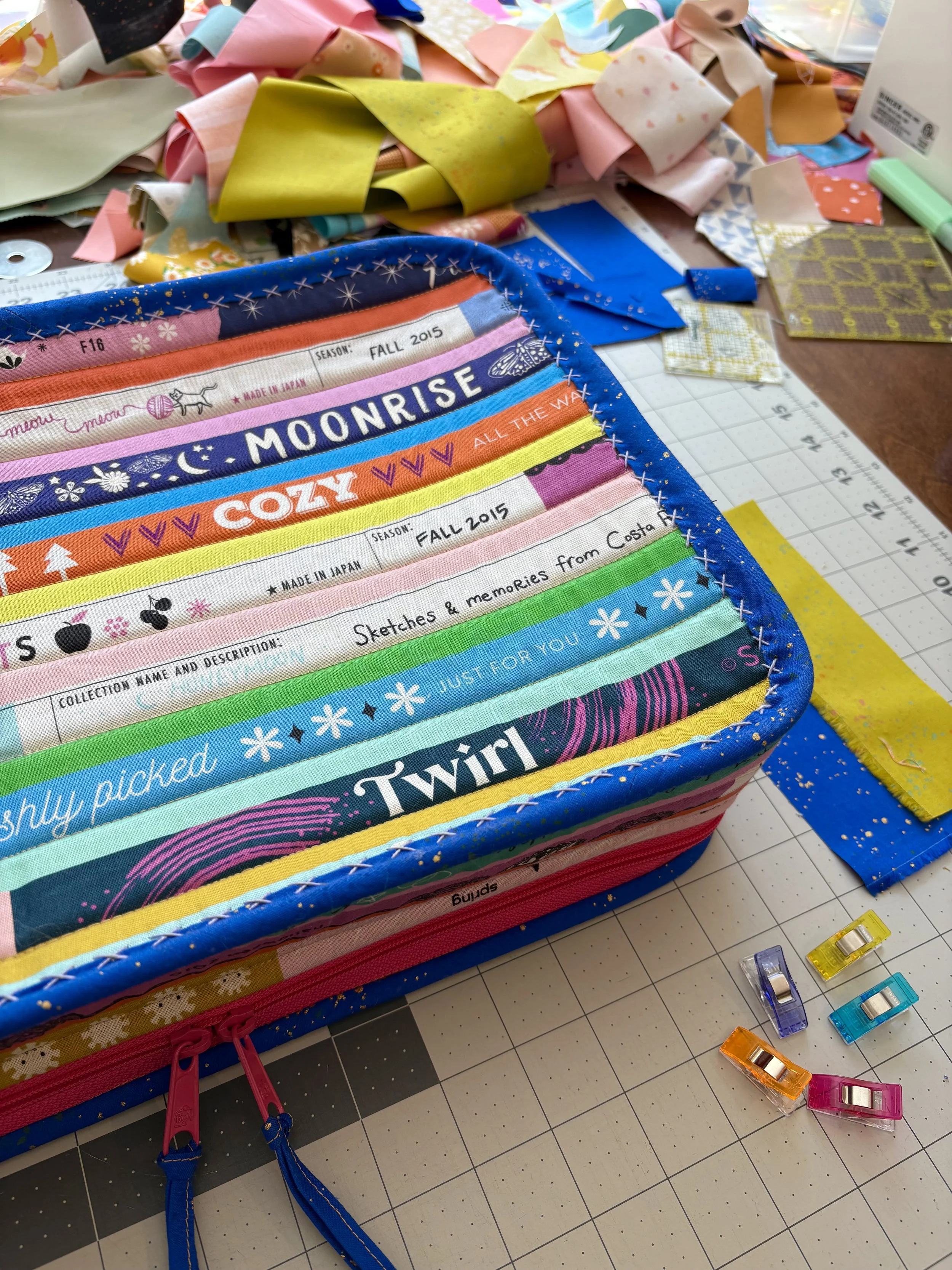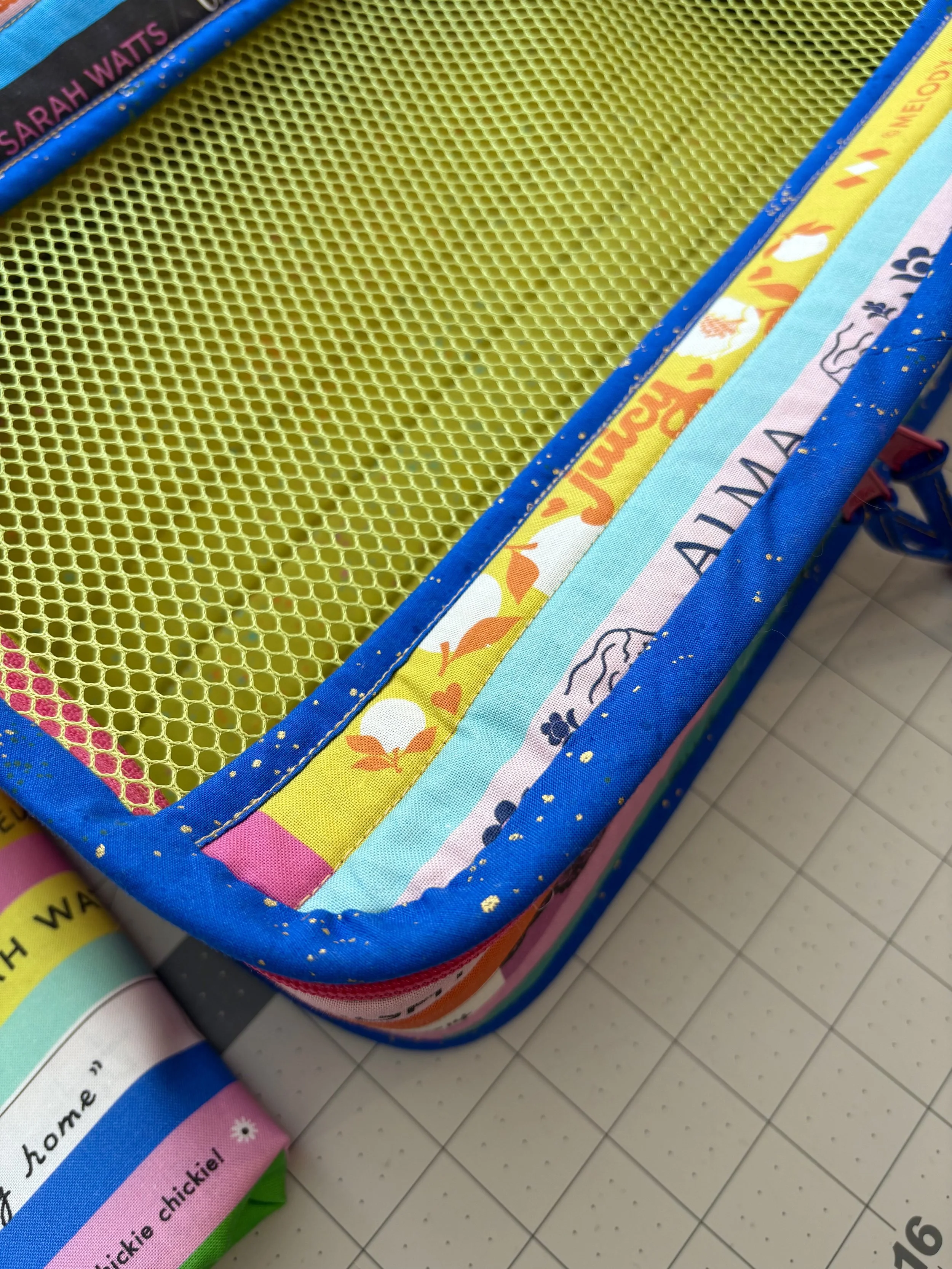 I absolutely love how this turned out! If you want to replicate this look, I would recommend sewing the binding to the bottom of the bag so you can put the big stitches on the zipper loop portion of the packing case. If you want to replicate this bag entirely, here are the materials I used.